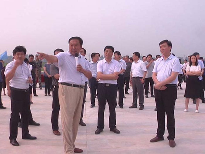 2018年7月19日,縣長王成宗(中)、開發(fā)區(qū)主任候會然(右一)在新公司施工現(xiàn)場視察工作